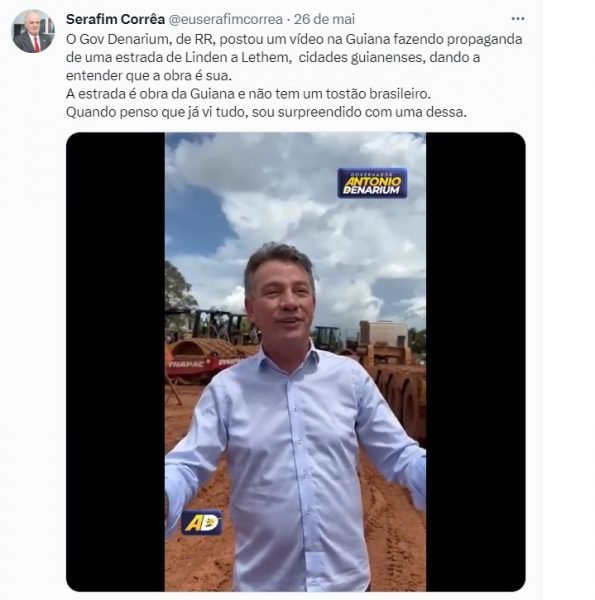 O ex-prefeito e ex-deputado de Manaus, Serafim Corrêa (PSB), usou o Twitter neste final de semana para criticar o governador de Roraima Antonio Denarium (Progressistas) por supostamente se apropriar da autoria pela obra de pavimentação da estrada Linden-Lethem, na Guiana.