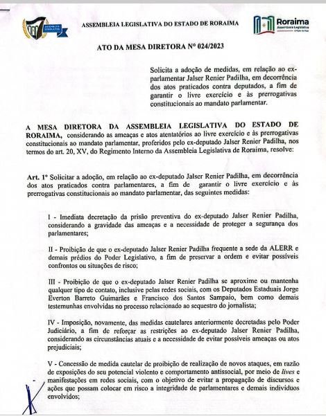 O juiz Cleber Gonçalves Filho, titular da 1ª Vara Criminal da Comarca de Boa Vista, emitiu despacho solicitando ao Ministério Público que se manifeste no prazo de 48 horas sobre o pedido de prisão do ex-deputado Jalser Renier Padilha. O despacho foi registrado nos autos do processo nº 0810831-62.2022.8.23.0010.