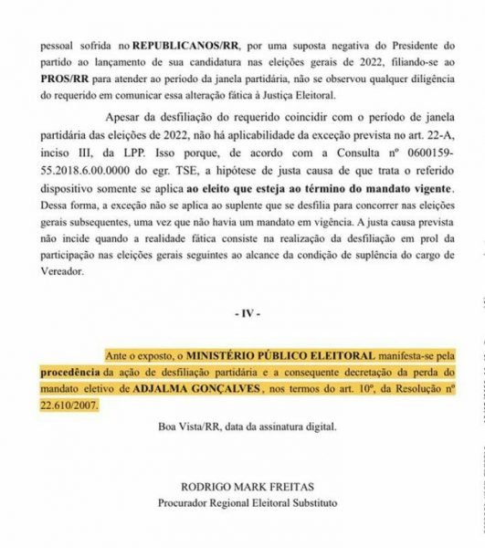 O parecer foi assinado pelo Procurador Regional Eleitoral, Rodrigo Mark Freitas, que explicou que, apesar da desfiliação de Adjalma ter ocorrido durante o período de janela partidária das eleições de 2022, a exceção prevista no art. 22-A, inciso III, da LPP não se aplica ao caso.