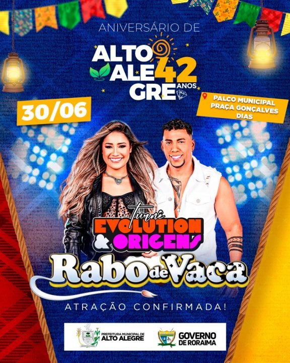 No período de 29 de junho a 1º de julho, Alto Alegre comemorará 42 anos de instituição em Roraima com o tradicional festejo. Serão três dias de atividades esportivas, de lazer, gastronomia, escolha da Rainha do Festejo, e muita música com bandas locais e a convidada, diretamente de Manaus, Rabo de Vaca, prevista para subir ao palco no dia 30 de junho (ver abaixo).