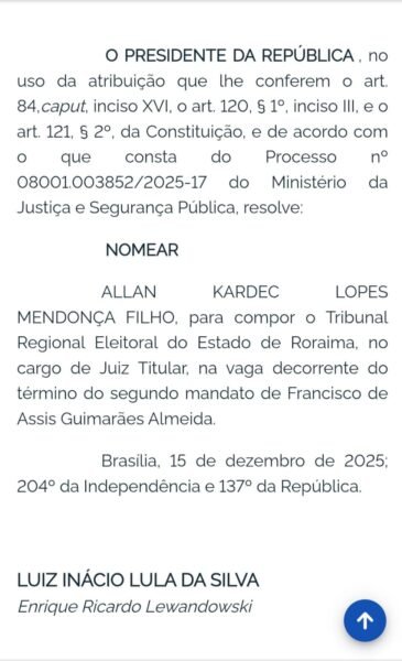 O presidente da República, Luiz Inácio Lula da Silva (PT), nomeou o advogado Allan Kardec Lopes Mendonça Filho para o cargo de juiz eleitoral titular do Tribunal Regional Eleitoral de Roraima (TRE-RR). A nomeação foi oficializada em ato publicado nesta terça-feira (15), com base em lista tríplice indicada pela Ordem dos Advogados do Brasil (OAB).