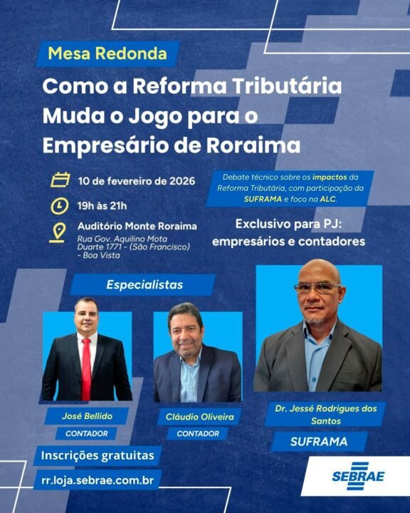 Empresários e contadores de Roraima terão uma oportunidade estratégica para entender, na prática, os impactos da reforma tributária sobre os negócios locais. Nesta terça-feira (10), o Sebrae Roraima promove a mesa redonda “Como a reforma tributária muda o jogo para o empresário roraimense”, um encontro técnico que discutirá os efeitos das novas regras na Área de Livre Comércio (ALC), no Simples Nacional e na competitividade das empresas da região.