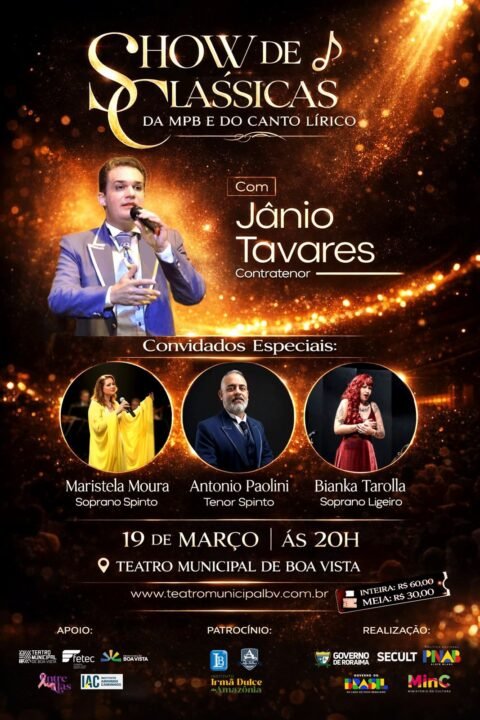 Uma noite para vestir o melhor traje, abrir o coração e deixar a música conduzir emoções. É com essa proposta que o “Show Clássicos da MPB e do Canto Lírico com Jânio Tavares” entra em cartaz no próximo dia 19 de março, às 20h, no Teatro Municipal de Boa Vista. Mais do que espetáculo, a apresentação promete ser um encontro entre glamour, arte e solidariedade.